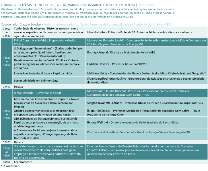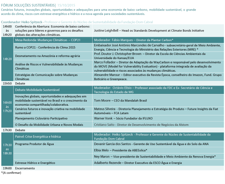 | Fórum Soluções Sustentáveis | 15/10/2015 | 14h00 às 18h10 |