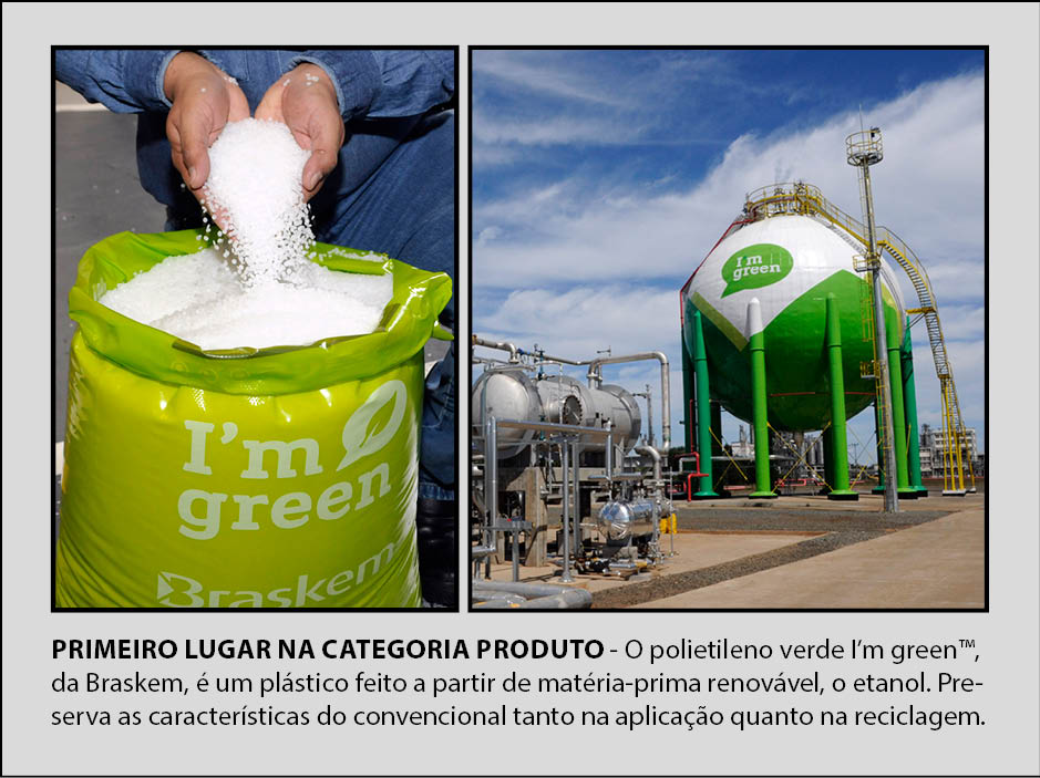O polietileno verde I’m green™ da Braskem, conhecido como plástico verde, foi o primeiro colocado da Categoria Produtos. Ele pode ser usado nas embalagens de alimentos, cosméticos, bebidas, sacolas, entre outros. O material é feito a partir do etanol, matéria-prima renovável da cana-de-açúcar brasileira, e preserva as mesmas características do polietileno convencional, que é produzido a partir do petróleo e gás natural.