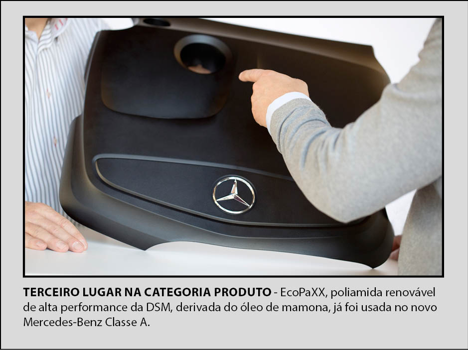 O EcoPaXX foi eleito o terceiro melhor produto sustentável. Desenvolvido pela empresa DSM, o EcoPaXX é um polímero de alta perfomance a partir de matéria renovável. O composto tem 70% de óleo de mamona em sua composição, é de alta resistência térmica, química e mecânica, além de ter um ótimo acabamento. Por essas características, foi escolhido para compor a tampa do motor do Mercedes Benz Classe A, o que resultou na diminuição de 40% dos índices de carbono do veículo em relação a outras coberturas de motor.
