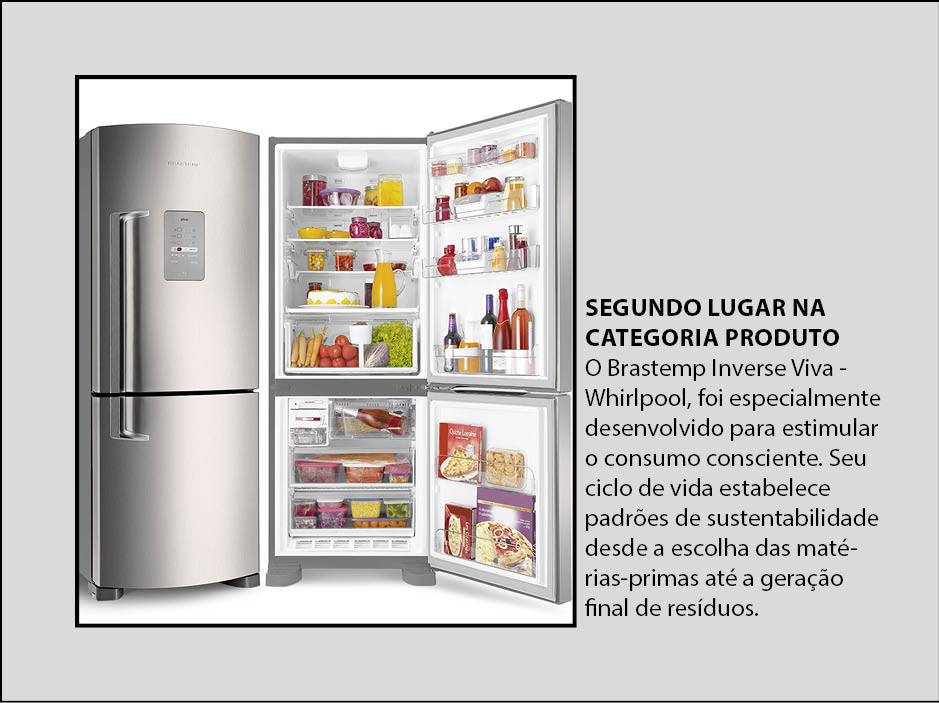 Ocupando a segunda posição da Categoria Produtos, está o Refrigerador Brastemp Inverse Viva! da Whirlpool Latin América. Ele é o primeiro com o conceito “Viva” e especialmente desenvolvido para estimular o consumo consciente. O aparelho reúne vários diferenciais ligados à sustentabilidade, desde a escolha das matérias-primas à geração final de resíduos.
